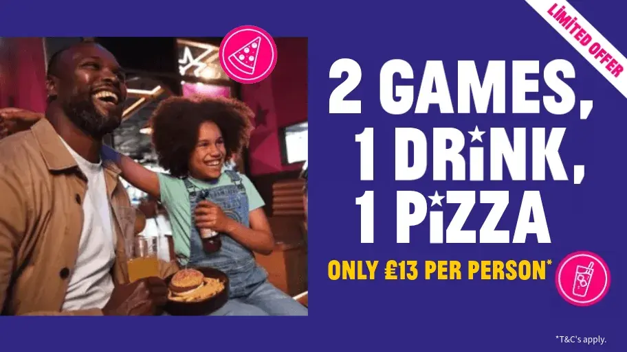 2 GAMES + 1 DRINK + 1 PIZZA for £13